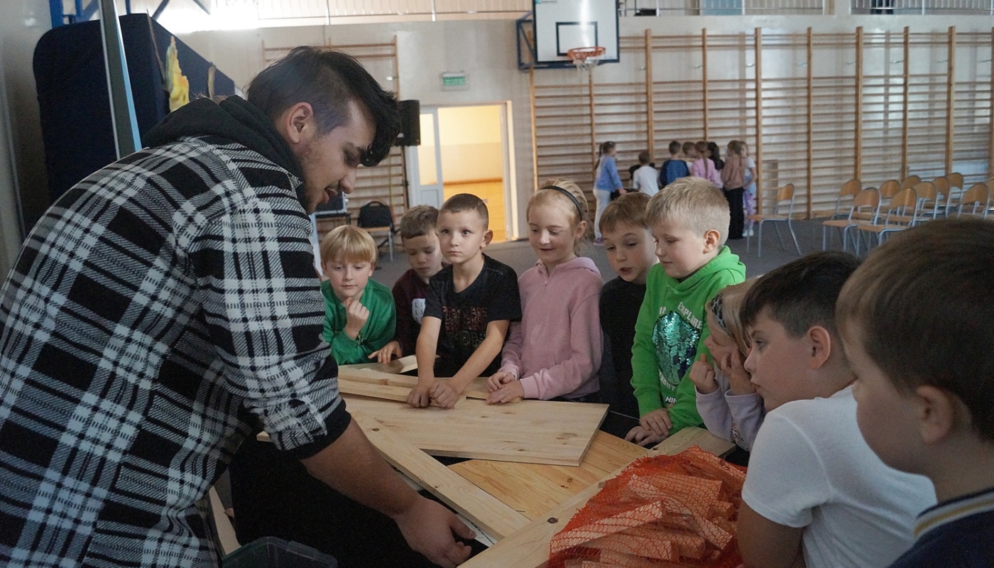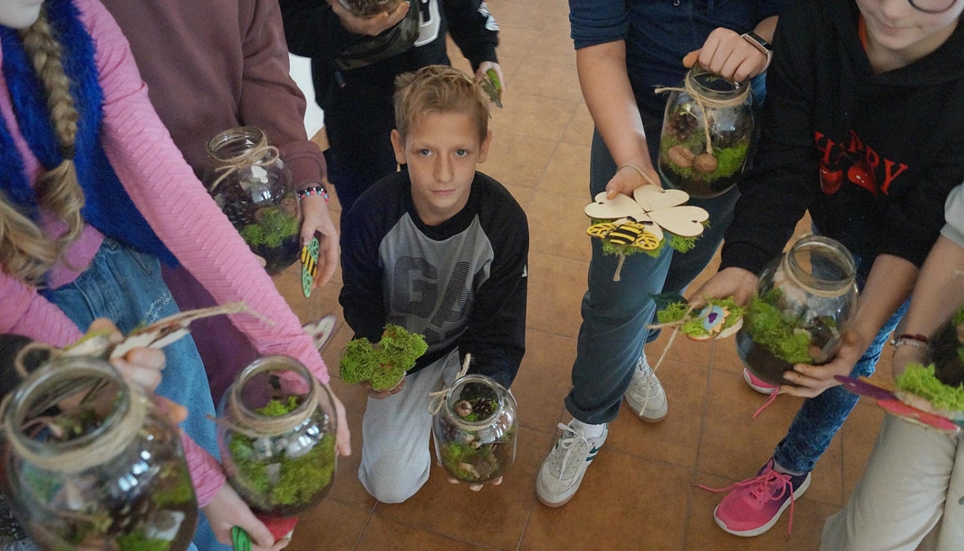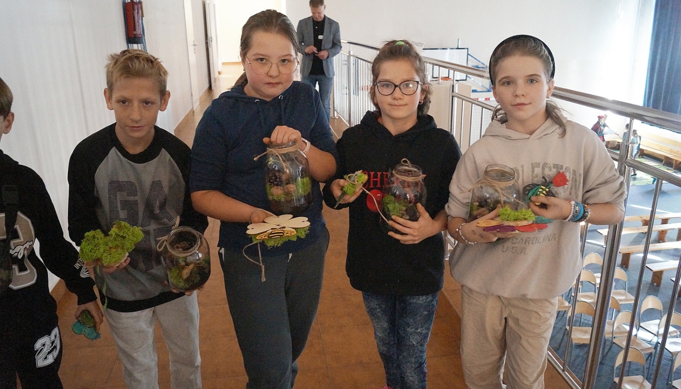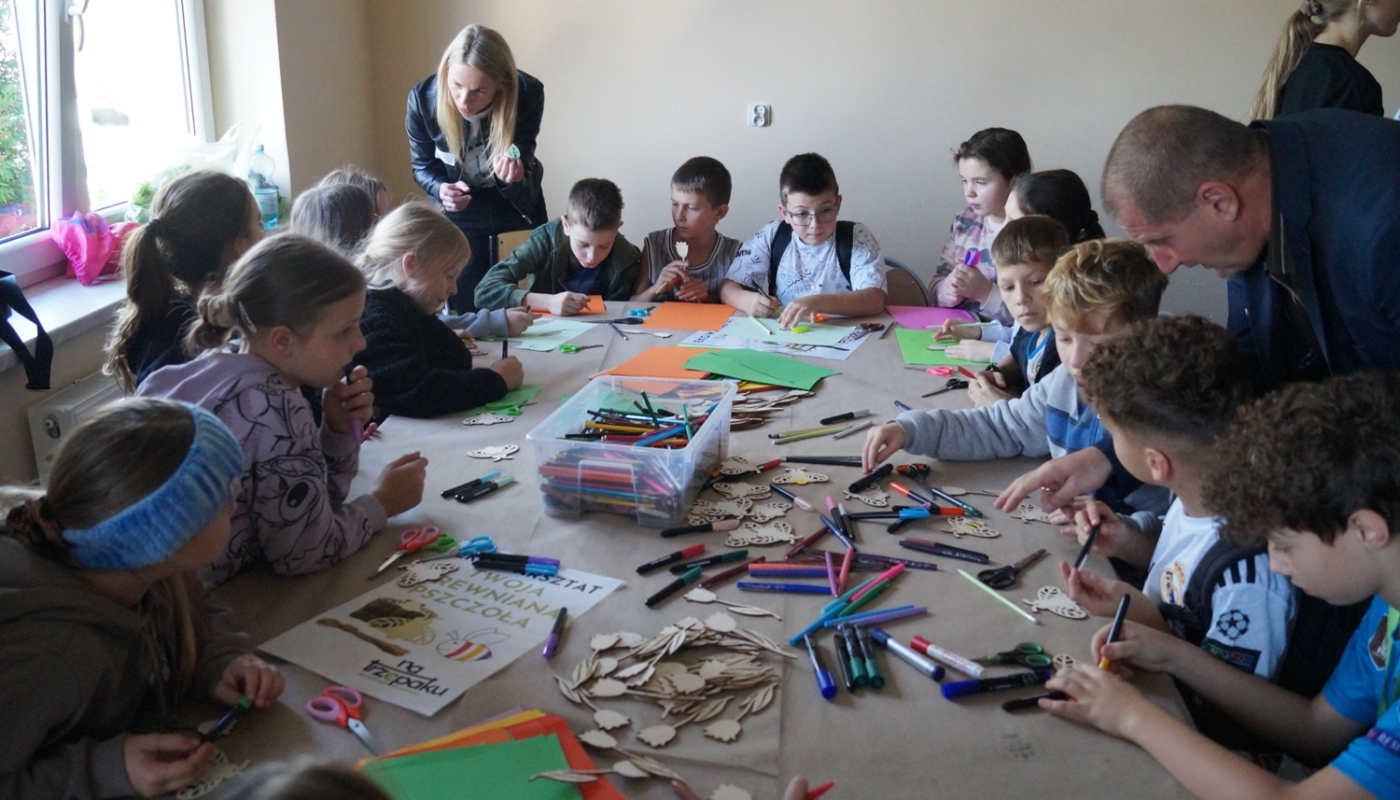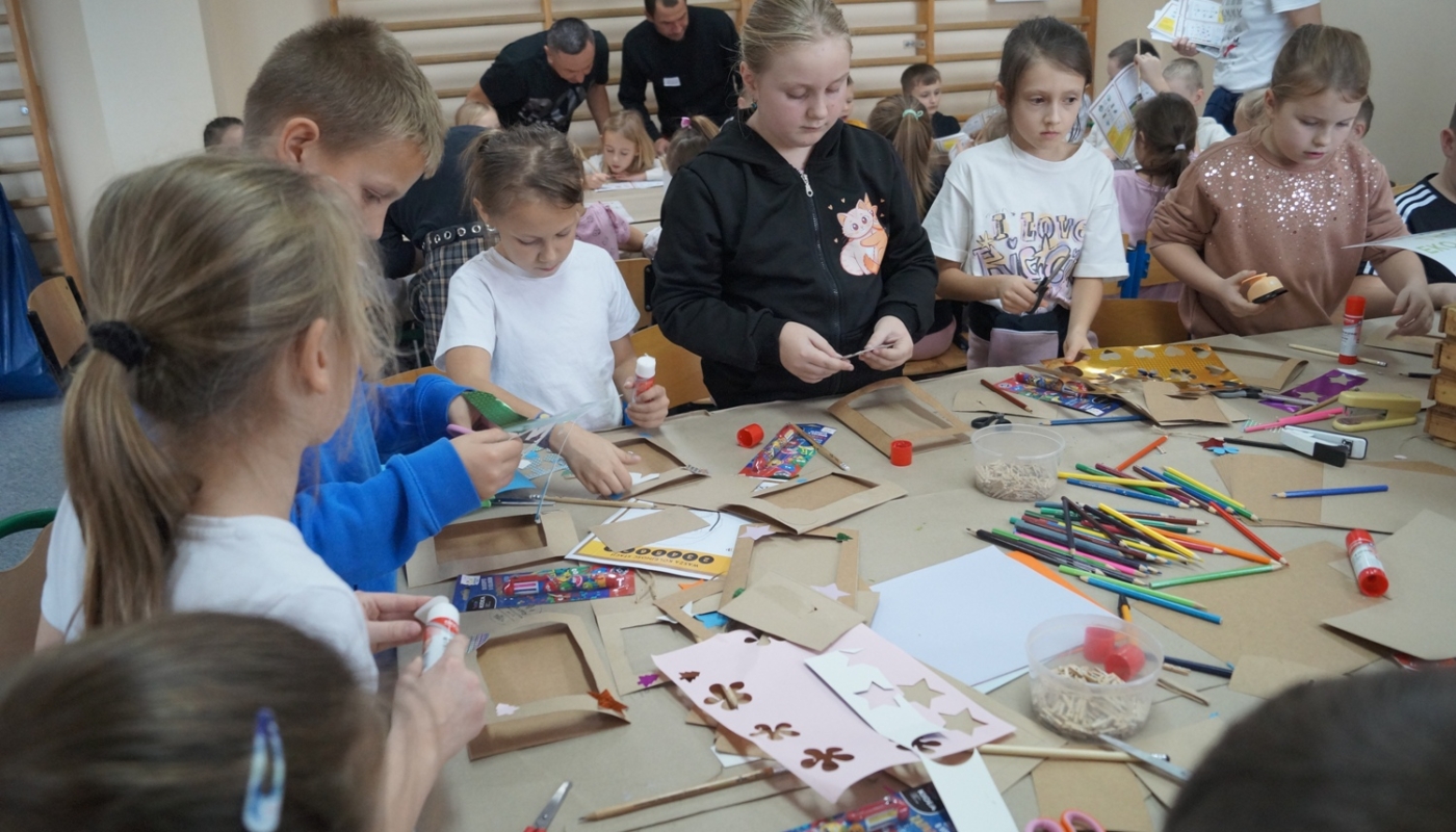 W przestrzeni warsztatowej uczniowie tworzyli naturalne dekoracje i przedmioty inspirowane przyrodą: zawieszki z chrobotkiem na drewnianych sercach, jesienne liście z życzeniami dla Przyrody, „szczęśliwą pszczołę”, las w słoiku oraz ekologiczne ramki do galerii zdjęć. Nie zabrakło również łamigłówek SuperBohatera Przyrody i zespołowej gry drewnianej, która rozwijała koncentrację, cierpliwość i komunikację.