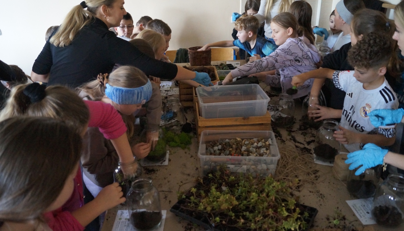 Starsze klasy włączyły się w działania terenowe wokół szkoły – sadzenie drzew i krzewów, ustawianie hoteli dla owadów oraz montaż budek lęgowych dla ptaków.