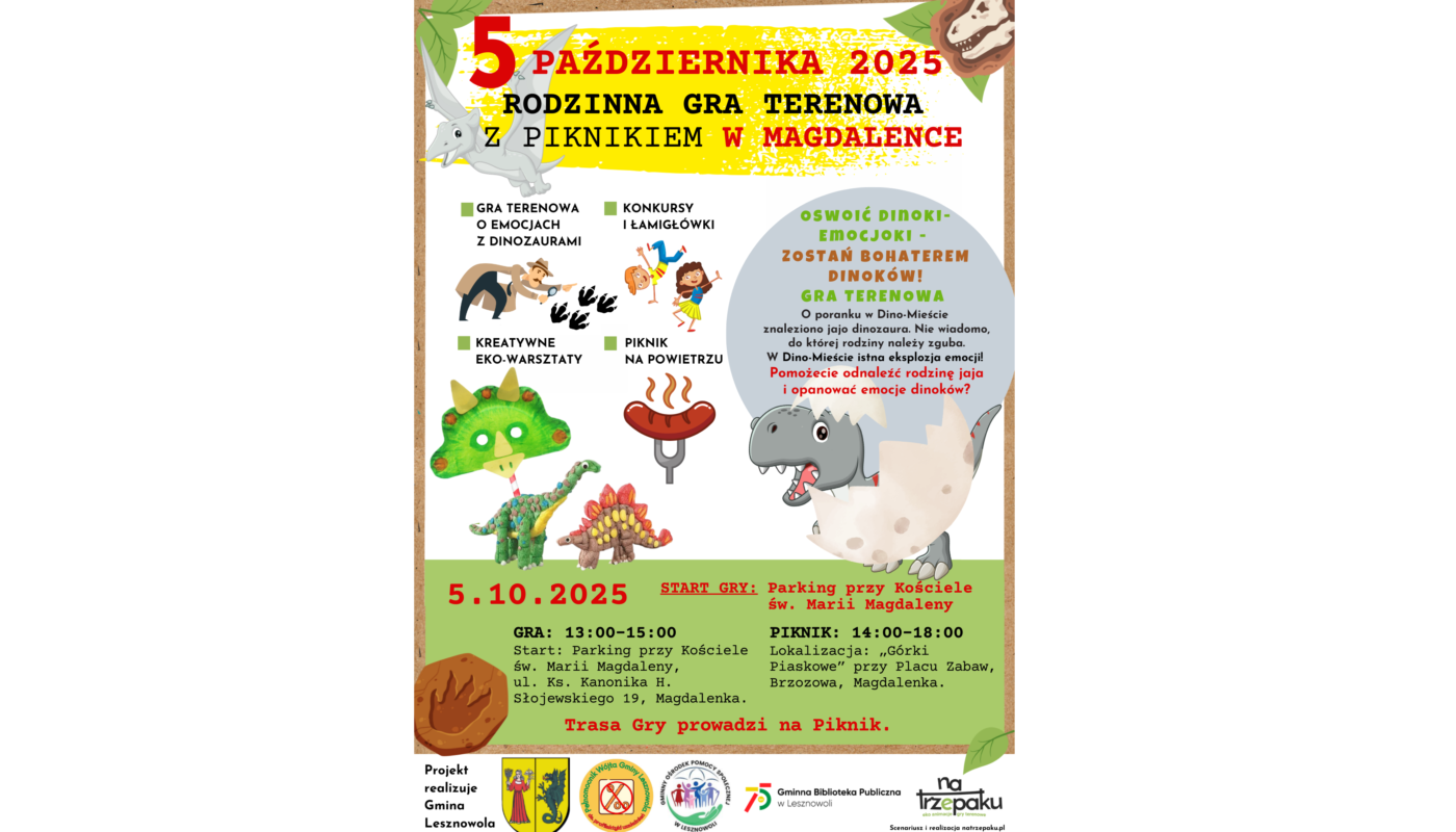 5 października 2025 r. w przestrzeni publicznej gminy Lesznowola odbyło się rodzinne wydarzenie społeczno-edukacyjne łączące integracyjno-profilaktyczną grę terenową „Oswój Dinoki-Emocjoki! Zostań Bohaterem Dinoków!” z mini piknikiem i eko-warsztatami. Organizatorem był Gminny Ośrodek Pomocy Społecznej w Lesznowoli, a realizację gry powierzono zespołowi NaTrzepaku.